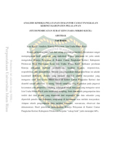 The good service performance of each Subdistrict greatly affects the result of maksimum service. The purpose of this study is to determine the service performance in the office of subdistrict Pangkalan Kerinci Pelalawan regency, study of Micro and Small Business License. The assessment indicators of service performance include Productivity, Servise quality, Responsivity, Responsibility, and Accountability. The method used in this research is quantitative descriptive, where the population is the people who see about micro small businees license in the office sub-district Pangkalan Kerinci and taken a sample of 12 people. The sampling technique used to subdistrict employee is purposive sampling, while for the people who attend of micro small business license used insidental sampling technique. Types and technique of data collection consist of primary data obtained from responden and secondary data obtained by authors from document, archives in subdistrict office or trough the community. As for data collection techniques trough questionnaires, interviews, observation and documentation. The result showed that service performance in sub district of Pangkalan Kerinci Pelalawan regency is said to be “good enough” that is reach 66%.