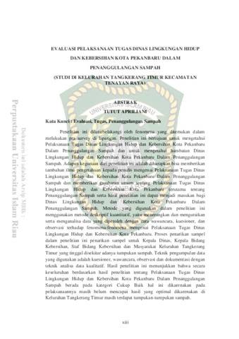 Apriliani, Tutut (2018) Evaluasi Pelaksanaan Tugas Dinas Lingkungan Hidup Dan Kebersihan Kota Pekanbaru Dalam Penanggulangan Sampah (Studi Di Kelurahan Tangkerang Timur Kecamatan Tenayan Raya). Other thesis, Universitas Islam Riau.