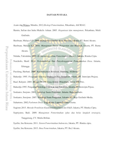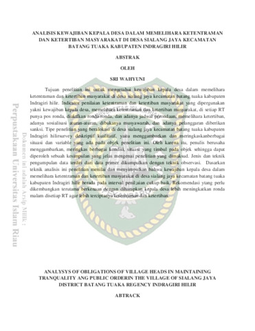 Wahyuni, Sri (2018) Analisis Kewajiban Kepala Desa Dalam Memelihara Ketentraman Dan Ketertiban Masyarakat Di Desa Sialang Jaya Kecamatan Batang Tuaka Kabupaten Indragiri Hilir. Other thesis, Universitas Islam Riau.