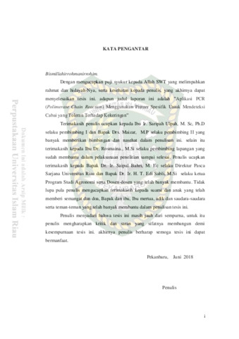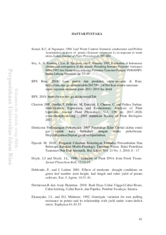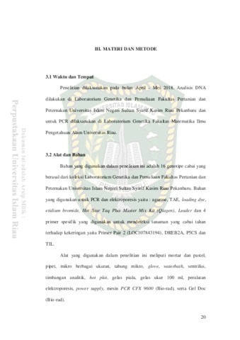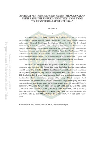 Ria oktavianti (144120008), PCR (Polymerase Chain Reaction) application using specific primers to detect drought tolerant ekillies. Supervised by Ir. Saripah Ulpah, M. Sc, Ph. D (Main Supervisor), Dr. Maizar, M.P (CoSupervisor) and Dr. Rosmaina M.Si (Technical Supervisor). This research was carried out in the Laboratory of Plant Breeding and Genetics of UIN SUSKA Riau, and the implementation of PCR in the Genetic Laboratory in the University of Riau. This research was done for 2 months, starting from May 2018 to June 2018. The purpose of this study was to find tolerant genotypes. This research was conducted on 16 chilli genotypes from UIN Suska Riau Laboratory of Breeding and Genetics. Using four specific primers wich were TIL, DREB2A, P5CS, and Primary Pair 2 (BLAS). Results of the study showed amplifikasi of chilli DNA could be obtained using TIL and Pair 2. Primer however th corsponding result were obtain only by using TI to be drought tolerant, while 5 genotypes were found drought intolerant. The drought tolerant genotypes were (RFC-005), (RFC-006), (G-UIN- 016), (G-UIN-015), (G-UIN065), (UIN-097), (UIN-035), (UIN-100), (UIN-099), (UIN-037) and (UIN-096). While 5 intolerant genotypes were (G-UIN-019), (G-UIN-008), (G-UIN-038), (RFC-013) and (UIN-036).