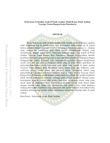 Armando, Denis (2018) Kekerasan Terhadap Anak di Panti Asuhan (Studi Kasus Panti Asuhan Yayasan Tunas Bangsa Kota Pekanbaru). Other thesis, Universitas Islam Riau.