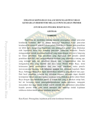 Yohesfi, Yohesfi (2018) Strategi Kepolisian Dalam Mencegah Pencurian Kendaraan Bermotor Melalui Pencegahan Primer (Studi Kasus Polsek Bukit Raya). Other thesis, Universitas Islam Riau.