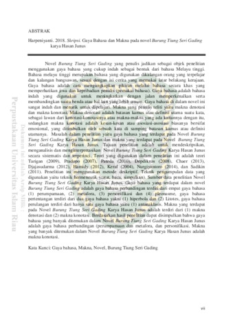 Harpeniyanti, Harpeniyanti (2018) Analisis Gaya Bahasa dan Makna Novel Burung Tiung Seri Gading Karya Hasan Junus. Other thesis, Universitas Islam Riau.