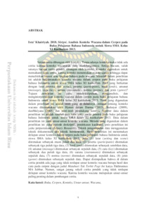 Setiap cerita dibangun oleh konteks. Tanpa adanya konteks maka tidak ada cerita karena konteks wacanalah yang membangunnya. Setiap bacaan, salah satunya bacaan cerita pendek dibangun oleh konteks. Konteks digunakan untuk memahami suatu cerita, karena konteks menentukan makna ujaran sehingga dapat menafsirkan situasi atau lingkup bahasa pada wacana. Masalah dalam penelitian ini adalah bagaimanakah konteks wacana dalam cerpen pada buku pelajaran bahasa Indonesia untuk siswa SMA kelas XI kurikulum 2013 yang berkaitan dengan latar (setting dan scene), peserta (participant), hasil (ends), amanat (message), cara (key), sarana (instrument), norma (norms), dan jenis (genre)? Tujuan penelitian ini yaitu mendeskripsikan, menganalisis, dan menginterpretasikan konteks wacana dalam cerpen pada buku pelajaran bahasa Indonesia untuk siswa SMA kelas XI kurikulum 2013. Teori yang digunakan dalam penelitian ini adalah teori yang di dalamnya terdapat tentang konteks wacana dikemukakan oleh Hymes dalam Darma (2013), Sudaryat (2009), danMulyana (2005) dan teori-teori pendukung lainnya. Sumber data dalam penelitian ini adalah sumber data tulis yaitu cerita pendek pada buku pelajaran bahasa Indonesia untuk siswa SMA kelas XI kurikulum 2013. Data dalam penelitian ini yaitu unsur-unsur konteks wacana. Metode yang digunakan dalam penelitian ini yaitu metode deskriptif, pendekatan kualitatif, jenis penelitian ini yaitu perpustakaan (Library Research). Teknik pengumpulan data menggunakan teknik dokumentasi dan teknik hermeneutik. Hasil penelitian ini menemukan delapan unsur konteks dalam cerpen pada buku pelajaran bahasa Indonesia untuk siswa SMA kelas XI kurikulum 2013, yaitu (1) latar (setting dan scene) ditemukan sebanyak enam puluh dua data, (2) peserta (participants) ditemukan sebanyak tiga puluh tiga data, (3) hasil (ends) ditemukan sebanyak sembilan data, (4) amanat (message) ditemukan sebanyak sepuluh data, (5) cara (key) ditemukan sebanyak dua puluh tiga data, (6) sarana (instruments) ditemukan sebanyak sepuluh data, (7) norma (norms) ditemukan sebanyak sepuluh data, (8) jenis (genre) ditemukan sebanyak sepuluh data. Dapat disimpulkan bahwa di dalam cerita pendek ada juga yang tidak terdapat unsur konteks wacana berupa hasil dan cara pada cerpen dengan judul Matahari Tak Terbit Pagi Ini karya Fakhrunnas MA Jabbar. Namun, sangat jarang sekali cerita pendek yang tidak terdapat delapan unsur konteks wacana. Karena konteks wacana merupakan unsur-unsur paling penting dalam pembangun cerita.