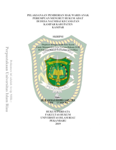 Saputra, Muhammad Ridho (2019) Pelaksanaan Pemberian Hak Waris Anak Perempuan Menurut Hukum Adat Di Desa Naumbai Kecamatan Kampar Kabupaten Kampar. Other thesis, Universitas Islam Riau.