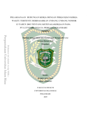 Agustian, Randy (2019) Pelaksanaan Hubungan Kerja Dengan Perjanjian Kerja Waktu Tertentu Berdasarkan Undang-undang Nomor 13 Tahun 2003 Tentang Ketenagakerjaan Pada PT Lutvindo Wijaya Perkasa Pekanbaru. Other thesis, Universitas Islam Riau.