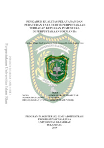 Sidabutar, Odor Juliana (2019) Pengaruh Kualitas Pelayanan Dan Peraturan Tata Tertib Perpustakaan Terhadap Kepuasan Pemustaka Di Perpustakaan Soeman HS. Masters thesis, Universitas Islam Riau.